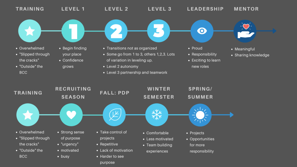 After interviewing at least 30% of each team (Client Success Specialists, Marketing, Data Analysts, Senior Managers), I created the following experience map outlining the “BCC experience” as told to me through their interviews. I found people shared their BCC experience from two perspectives, one being a seasonal perspective of moving through the different BCC time periods, and the other a hierarchical experience, telling the experience through various promotions and roles.