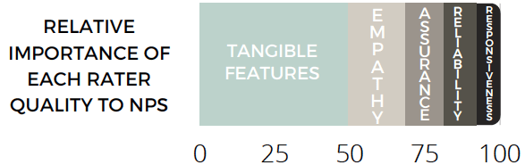 The RATER service quality metrics are a series of metrics designed to measure the perceived quality of service in the specific categories of reliability, assurance, tangible features, empathy, and responsiveness. Our hypothesis was that these metrics would relate to the likelihood of a participant to recommend the experience, also known as the Net Promoter Score (NPS).